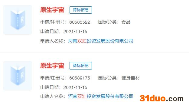 譬如双汇发展(000895),天眼查显示,其已在11月15日申请注册两个“原生宇宙”商标,国际分类分别涉及食品、健身器材。目前,上述商标状态均为申请中。