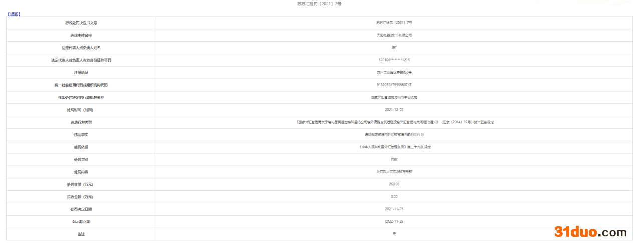 决定书显示,天佑电器(苏州)有限公司存在违反规定将境内外汇转移境外的逃汇行为,违反了《国家外汇管理局关于境内居民通过特殊目的公司境外投融资及返程投资外汇管理有关问题的通知》(汇发〔2014〕37号)第十五条规定。国家外汇管理局苏州市中心支局依据《中华人民共和国外汇管理条例》第三十九条规定,对其处罚款人民币260万元整。
