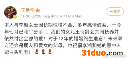 11月30日,王岳伦发布微博,宣布与李湘已于今年7月份和平离婚。