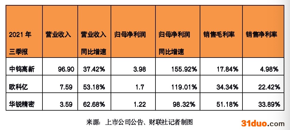 从三家公司的利润和毛利率来分析,2021年三季报显示,中钨高新、欧科亿、华锐精密归母净利润分别为3.98亿元、1.7亿元、1.22亿元,同比分别增长155.92%、119.01%,98.32%,销售毛利率分别增长17.84%、34.34%和51.18%。