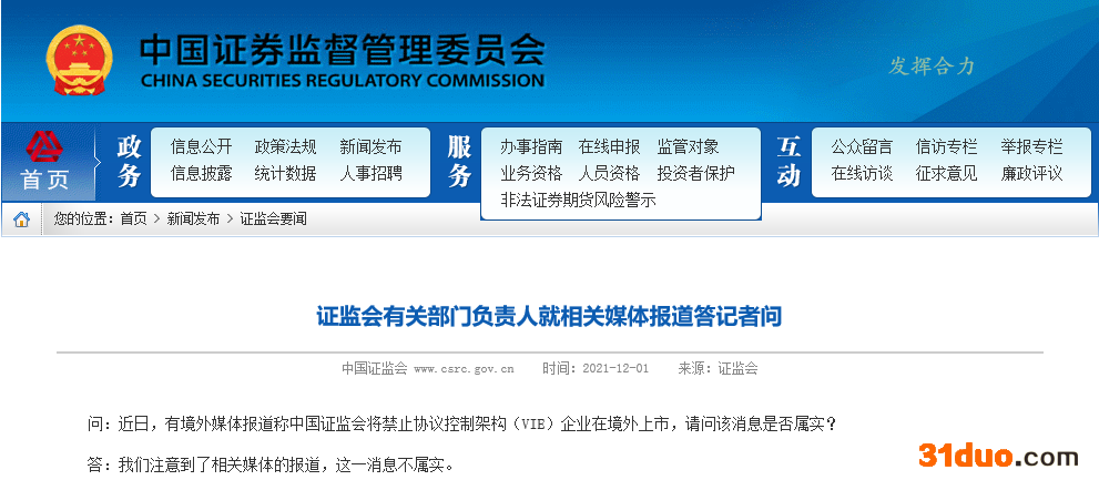 中国经济网北京12月1日讯 近日,有境外媒体报道称中国证监会将禁止协议控制架构(VIE)企业在境外上市。证监会有关部门负责人今日就相关媒体报道答记者问,称“我们注意到了相关媒体的报道,这一消息不属实”。