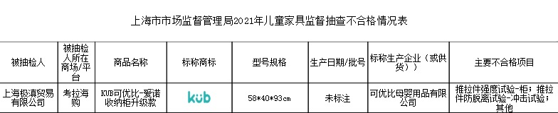 中国网财经注意到,标称由可优比母婴用品有限公司生产(或供货)的KUB可优比-爱诺收纳柜升级款(规格型号:58*40*93cm;生产日期或批号:未标注),推拉件出现脱落(标准要求零、部件应无断裂、豁裂或脱落),与国家强制性标准要求不符,另外,该批次推拉件防脱离试验中,推拉件出现脱落,推拉件防脱离试验也不合格,与国家强制性标准要求不符。