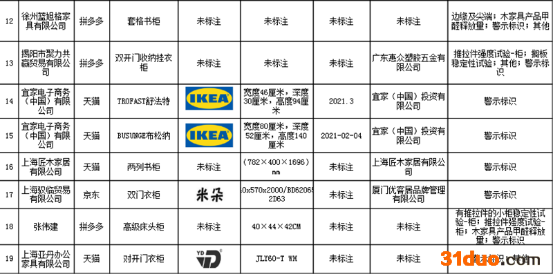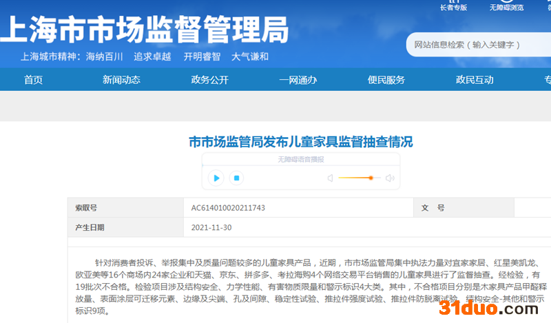 中国网财经12月1日讯 据上海市市场监管局网站消息,针对消费者投诉、举报集中及质量问题较多的儿童家具产品,近期,上海市市场监管局集中执法力量对宜家家居等16个商场内24家企业和4个网络交易平台销售的儿童家具进行了监督抽查。经检验,有19批次不合格。检验项目涉及结构安全、力学性能、有害物质限量和警示标识4大类。其中,不合格项目分别是木家具产品甲醛释放量、表面涂层可迁移元素、边缘及尖端、孔及间隙、稳定性试验、推拉件强度试验、推拉件防脱离试验、结构安全-其他和警示标识9项。