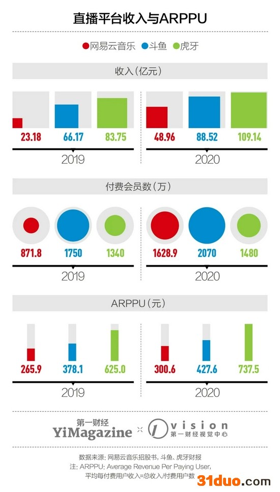 对比网易云音乐与虎牙、斗鱼的财报不难发现,无论是收入、付费会员数还是在付费用户上获得的平均收入(ARPPU),初涉直播领域的网易云音乐均明显落后于传统直播平台。专注音乐直播的劣势,就是业务收入的天花板不高。加之抖音、快手等短视频平台也纷纷布局该赛道,公司若想依赖直播业务扭亏为盈,其实不容易。