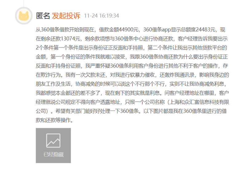 值得一提的是,黑猫投诉平台有用户投诉称,其在贷款平台“360借条”借款后遭到软暴力催收。在与客户经理协商还款时,客户经理仅报了公司名称为“上海和众汇富信息科技有限公司”。