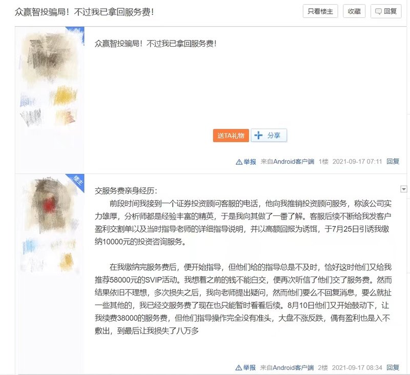 亦有用户于今年9月17日在百度贴吧平台表示,众赢智投为骗局。据该用户描述,其接到自称证券投顾客服的推销电话,以高额回报为诱饵,先后引诱该用户缴纳共计10.6万元投资咨询服务费。后投资结果始终不理想,多次损失之后,该用户提出疑问,众赢智投方出现不予回复情况。最后该用户损失逾8万元。![]()