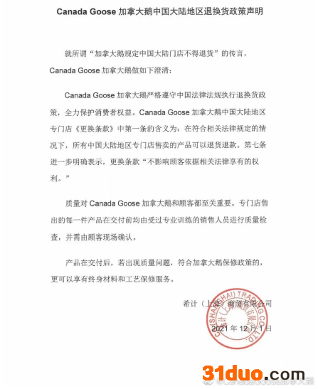 12月1日上午10点左右,加拿大鹅在其官方微博@CanadaGoose加拿大鹅 就中国大陆地区退换货政策发布声明称,加拿大鹅中国大陆地区专门店《更换条款》中第一条的含义为:在符合相关法律规定的情况下,所有中国大陆地区专门店售卖的产品可以退货退款。第七条进一步明确表示,更换条款“不影响顾客依据相关法律享有的权利。”