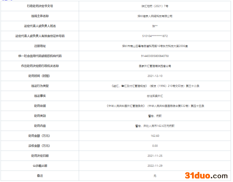 中国经济网北京12月1日讯 外汇局网站近日披露的陕汇检罚〔2021〕7号显示,深圳维京人网络科技有限公司网络科技有限公司非法买卖外汇。国家外汇管理局陕西省分局依据《中华人民共和国外汇管理条例》(中华人民共和国国务院令第532号)第四十五条,对深圳维京人网络科技有限公司警告,并处人民币162.6万元罚款。