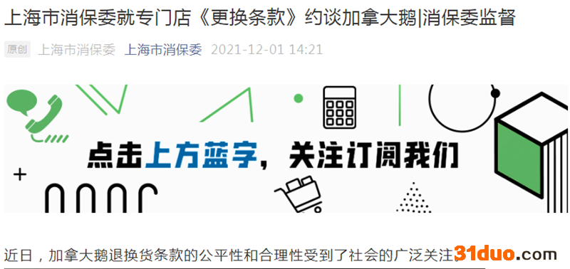 中国网财经12月1日讯 近日,加拿大鹅退换货条款的公平性和合理性受到了社会的广泛关注。今日“上海市消保委”微信公众号发布消息称,上海市消保委就专门店《更换条款》约谈加拿大鹅,并要求加拿大鹅在12月2号中午前提交《更换条款》的正式说明。