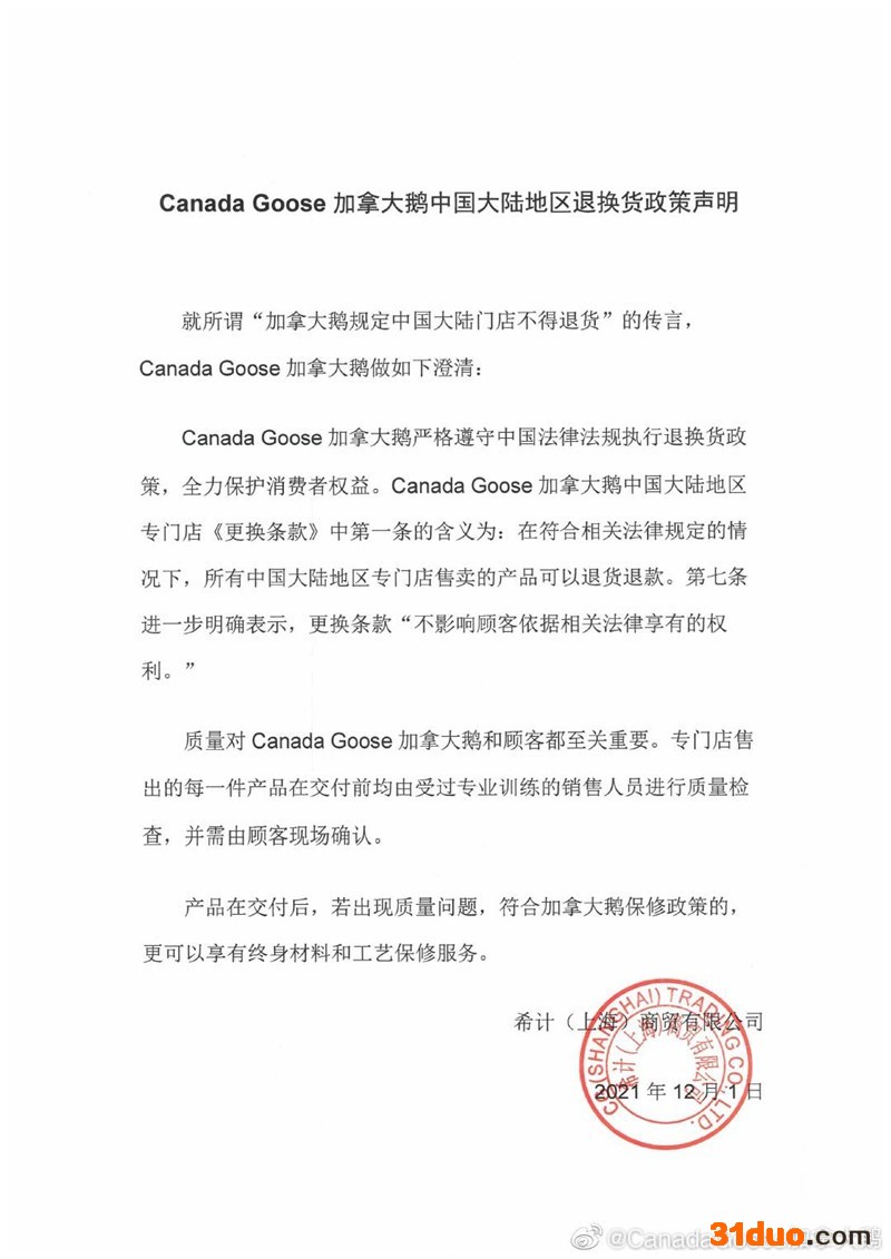 今日上午,CanadaGoose加拿大鹅官方微博就中国大陆地区退换货政策发布声明。声明称,加拿大鹅严格遵守中国法律法规执行退换货政策,全力保护消费者权益。加拿大鹅中国大陆地区专门店《更换条款》中第一条的含义为:在符合相关法律规定的情况,所有中国大陆地区专门店售卖的产品可以退货退款。第七条进一步明确表示,更换条款“不影响顾客依据相关法律享有的权利。”