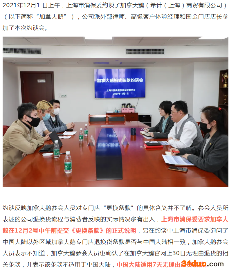 上海市消保委指出,约谈反映加拿大鹅参会人员对专门店“更换条款”的具体含义并不了解。参会人员所表述的公司退换货流程与消费者反映的实际情况多有出入,上海市消保委要求加拿大鹅在12月2号中午前提交《更换条款》的正式说明,另在约谈中上海市消保委询问了中国大陆以外区域加拿大鹅专门店退换货条款是否与中国大陆相一致,加拿大鹅参会人员表示不知道,加拿大鹅参会人员也确认了在加拿大鹅官网上30日无理由退货的相关条款,并表示该条款不适用于中国大陆,中国大陆适用7天无理由退货条款。