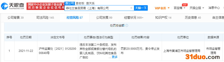 中国经济网北京12月1日讯 近日,中国经济网记者在天眼查发现,菲仕兰食品贸易(上海)有限公司因发布声称全部或者部分替代母乳的婴儿乳制品、饮料和其他食品广告,被上海市黄浦区市场监督管理局罚款20万元。