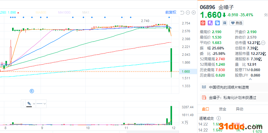 财联社(上海,编辑 周新旸)讯,11月30日盘后,金嗓子(06896.HK)宣布,其私有化计划失败。金嗓子的股价在周三(12月1日)开盘初跌幅高达40%,之后跌幅略有收窄,截止发稿时报价1.63港元,跌0.94港元或36.58%。