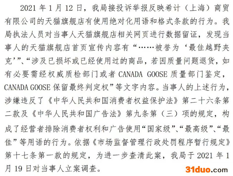 事实上,在本次“退换货”事件发生之前,加拿大鹅在国内的经销商公司就曾因虚假宣传以及使用绝对化用语和格式条款的行为被官方点名,并处以行政罚款。