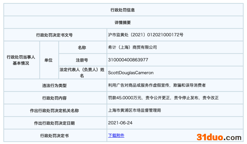 事实上,除本次退换货一事引发争议外,加拿大鹅此前还曾因虚假宣传一事陷入舆论漩涡。上海市市场监督管理局官网显示,今年6月,加拿大鹅中国经销商希计(上海)商贸有限公司因利用广告对商品或服务作虚假宣传,欺骗和误导消费者,被上海黄浦区市场监督管理局处罚45万元。