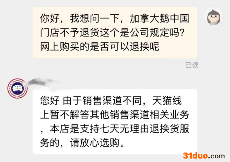 加拿大鹅线下不退线上退?回应称专门店内均可退货退款
