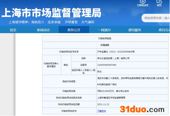 沪市监黄处〔2021〕012020000848号罚单显示,当事人为菲仕兰食品贸易(上海)有限公司。具体来看,2020年7月16日,上海市黄浦区市场监督管理局接举报,称天猫网络平台商店“皇家美素佳儿官方旗舰店”中,在一款名为“【皇家美素力】荷兰原装进口奶粉1段800g*1(适用0-6个月)”的产品宣传页面中有“天然含有乳磷脂、天然含有OPO类似结构脂、天然乳铁蛋白……科技解密母乳珍稀营养”“亲近源乳比例、促进DHA吸收珍稀乳磷脂营养组成比例接近源乳”等内容。