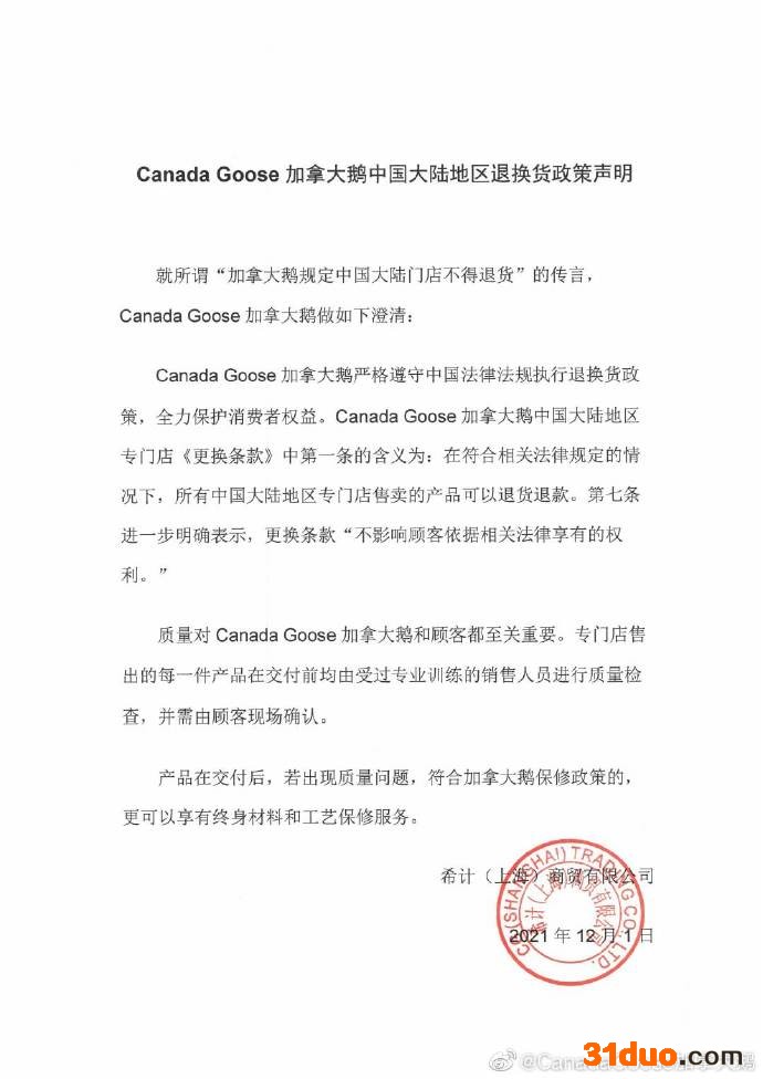 中新经纬12月1日电 12月1日,加拿大鹅就中国大陆地区退换货政策发布声明,称在符合相关法律规定的情况下,所有中国大陆地区专门店售卖的产品可以退货退款。