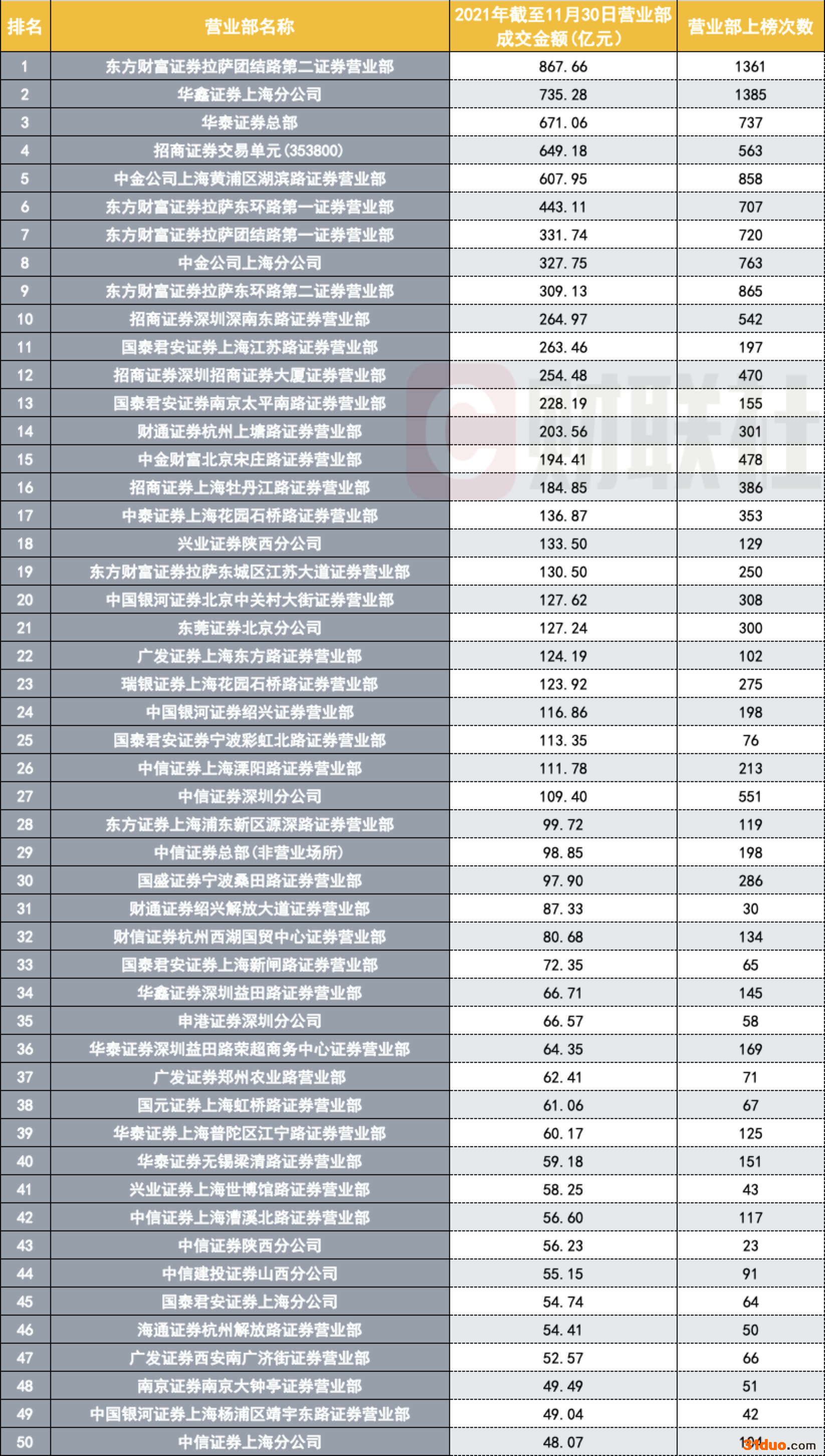截至11月30日,2021年共有5家券商营业部在股票龙虎榜上的成交额超过500亿,27家营业部龙虎榜成交额超过百亿。