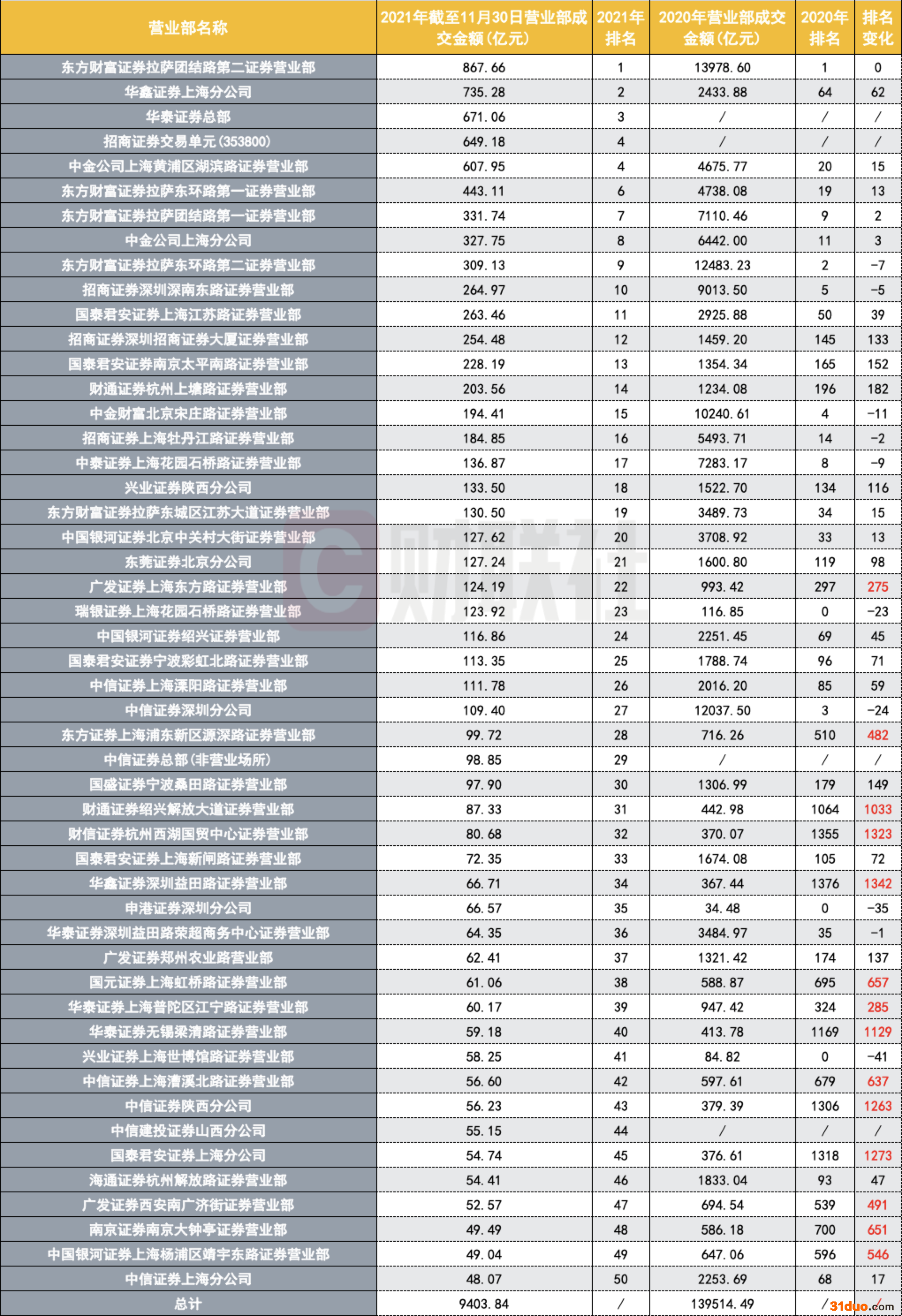 龙虎榜营业部大洗牌:50强中半数被挤出,6家排名提升超1000位,财通、财信、华鑫…背后都有“新故事” 2021-12-01 13:22 来源:财联社