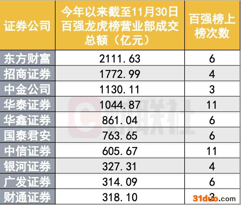 截至11月30日,今年以来招商证券交易单元以649.18亿元的成交额位居第4位,第5位是中金公司上海黄浦区湖滨路证券营业部,成交额达到607.95亿元;东方财富证券拉萨东环路第一证券营业部以443.11亿元的成交额位居第6位。