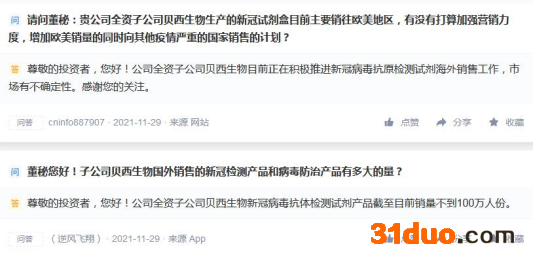 11月29日,天瑞仪器在投资者互动平台回应了多个投资者提问,主要针对新冠检测试剂内容,包括“全资子公司贝西生物目前正在积极推进新冠病毒抗原检测试剂海外销售工作”“目前主要在欧洲、美洲部分国家有少量销售”“部分检测试剂产品已取得CE认证”等内容。