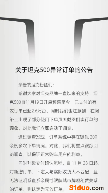 11月27日,坦克品牌在《关于坦克500异常订单的公告》中称:“订单系统中存在疑似200余例多次下单的情况。同时升级交付确认流程,自11月28日起,对新增订单,下定人与实际收货人不匹配,且无法证明直系亲属或者限牌城市牌照车辆租赁关系的订单,则认定为无效订单。”