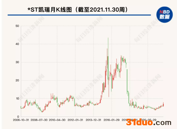 2021年11月22日,*ST凯瑞公告称,公司2020年因净资产为负,净利润为负且营业收入低于1亿元,股票交易被实施了退市风险警示。