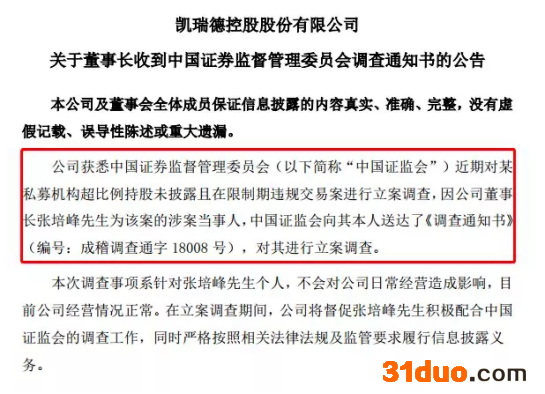 2018年7月21日,凯瑞德发布公告称,公司董事长张培峰因涉嫌操纵证券市场案分别在7月19日、7月18日被执行指定居所监视居住。在此之前,张培峰也辞去了公司董事长职务。