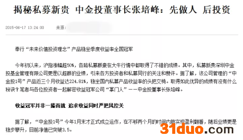 而张培峰在国内名声大噪,始于2015年的牛市。当时,张培峰是私募深圳中金投基金管理有限公司(以下简称“中金投”)的董事长,公司管理的产品曾经3个月收益达224.81%。他也因此成为炙手可热的私募黑马、季度冠军,时常出现在媒体的报道中,发表一些选股观点和对二级市场的看法。