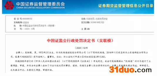 2020年9月,提携张培峰进入凯瑞德董事会的吴联模,遭证监会罚没5.13亿元,同时还被终身市场禁入。