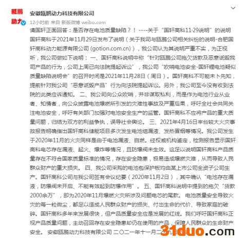 11月29日晚间,瓯鹏动力就国轩高科的说明回应称,对于国轩高科提出的诽谤诉讼,公司至今没有收到法院的此类应诉通知。而国轩高科说明中提到的拖欠“货款2000余万”,即为2020年11月爆燃火灾中已经损毁电芯的尾款。