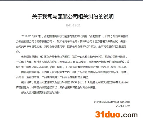 据了解,事件源于2019年10月22日,国轩高科与瓯鹏动力、某知名电单车公司(H公司)三方签署了采购协议,供应H公司共享电单车锂电池包,国轩高科负责供应电芯,瓯鹏动力负责PACK研发、生产和成品交付及售后服务。