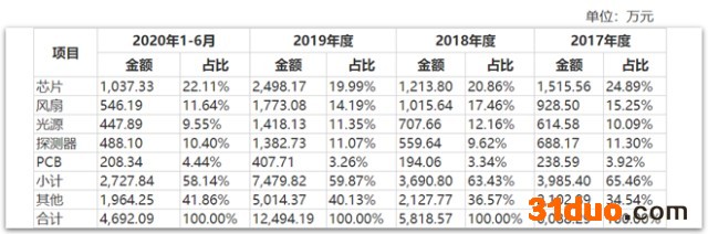 四方光电也并不例外。招股书显示,公司专注于气体传感器、气体分析仪器的整体设计及软件算法等环节,所需的大部分零部件直接向外采购。报告期内,公司主要外购原材料为芯片、风扇、光源、探测器、PCB等,主要原材料的外购情况如下表所示: