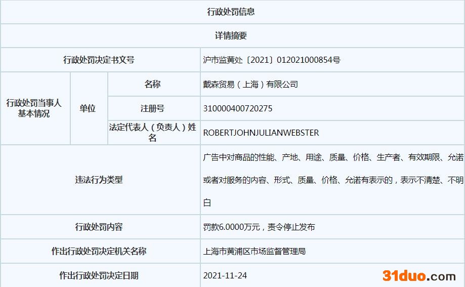 中新经纬12月3日电 据上海市市场监管局网站显示,11月24日,戴森贸易(上海)有限公司因“广告中对商品的性能、产地、用途、质量、价格、生产者、有效期限、允诺或者对服务的内容、形式、质量、价格、允诺有表示的,表示不清楚、不明白”,被上海市黄浦区市场监督管理局罚款6万元。