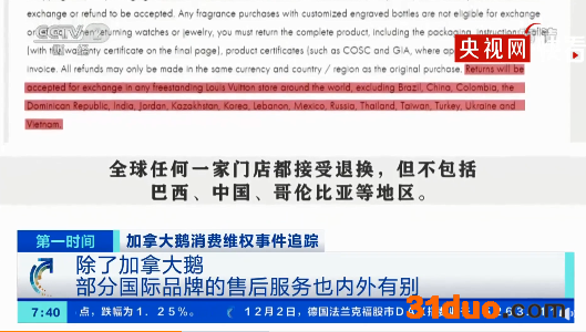 据央视报道,除了“加拿大鹅”,记者调查发现,一些被中国消费者追捧的其他国际品牌,在售后服务上,也存在内外有别的现象。鉴于一些消费者的经历,记者就横向对比了几个品牌在中国的销售政策。比如某知名奢侈品牌(路易威登)在中国大陆是7天内可以退货,30天内可换货,但是在美国、加拿大就可以30天内退货。记者注意到,该品牌在这些国家退换货政策的最后,还专门标注了这样一句话:全球任何一家门店都接受退换,但不包括巴西、中国、哥伦比亚等地区。