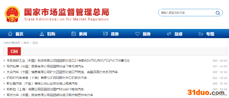 12月3日,据国家市场监督管理总局网站消息,多家汽车公司向国家市场监督管理总局备案了召回计划,将召回部分存在缺陷的汽车产品,详情如下: