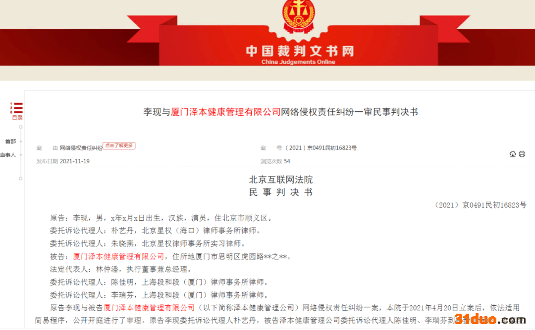 中国网财经12月3日讯(记者 李静)近日,祛痘品牌SOR(索尔祛痘)中国区运营中心厦门泽本健康管理有限公司因“侵犯明星李现肖像权姓名权”一审被判赔八万元。