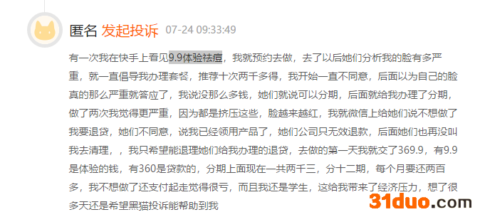 还有消费者投诉称,看到9.9元体验项目广告,到店里体验祛痘,却一直被推销办理套餐,因钱款不足,在推销员的帮助下办理了分期。但做了两次,脸没好反而更严重了,要求退款。但店员以“已领用产品”为由拒绝退贷。