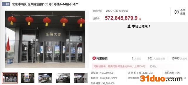 阿里司法拍卖网显示,11月30日上午10点整,北京市朝阳区姚家园路105号3号楼1-14层不动产被成功拍卖。该不动产即乐视网公司总部乐融大厦(原北京乐视大厦),此次拍卖有1.57万人围观,1人报名,唯一的竞买人北京衡盈物业管理有限公司以5.73亿元竞拍成功。