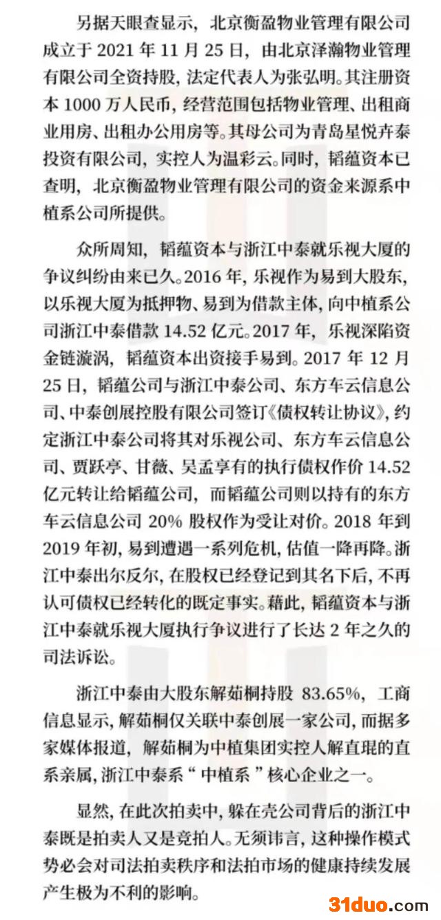 韬蕴资本在声明中称,北京衡盈物业管理有限公司的资金来源系中植系公司。韬蕴资本与中植系公司浙江中泰就乐视大厦的争议纠纷由来已久。此次拍卖中,躲在壳公司背后的浙江中泰既是拍卖人又是竞拍人。