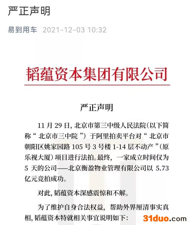 12月3日,韬蕴资本通过易到用车微信公众号就乐视大厦以5.7亿元法拍成交,发布声明称:深感震惊和不解。