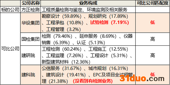 方正检测的主营业务为工程质量检测与鉴定、环境监测及相关服务。在资产评估报告中,沃克森选取华设集团、国检集团、建研院及建科院作为可比上市公司,却没有给出选择可比公司得依据。