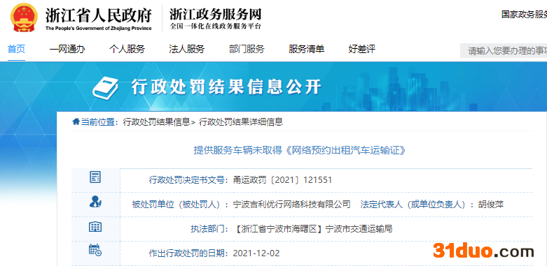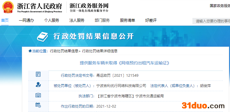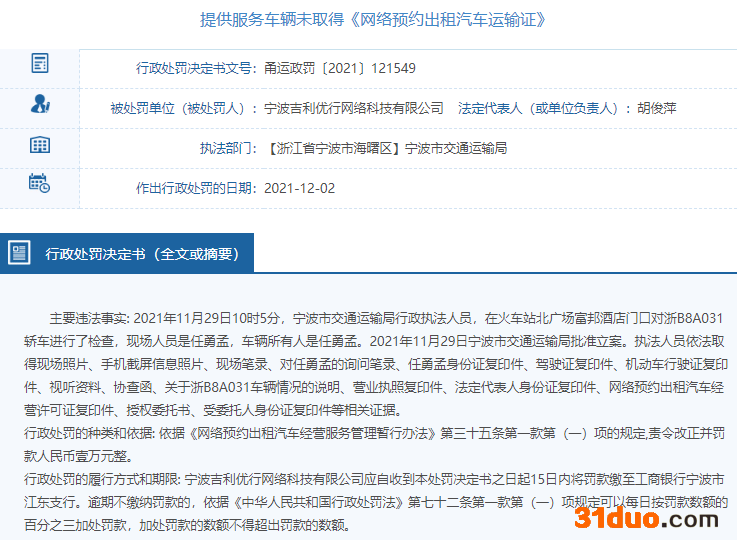 其中行政处罚决定书(甬运政罚〔2021〕121549)显示,主要违法事实为:2021年11月29日10时5分,宁波市交通运输局行政执法人员,在火车站北广场富邦酒店门口对浙B8A031轿车进行了检查,现场人员是任勇孟,车辆所有人是任勇孟。2021年11月29日宁波市交通运输局批准立案。依据《网络预约出租汽车经营服务管理暂行办法》第三十五条第一款第(一)项的规定,宁波市交通运输局责令宁波吉利优行网络科技有限公司改正并罚款人民币1万元整。