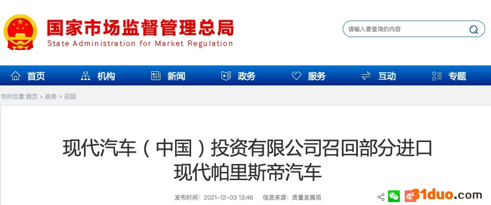 日前,现代汽车(中国)投资有限公司根据《缺陷汽车产品召回管理条例》和《缺陷汽车产品召回管理条例实施办法》的要求,向国家市场监督管理总局备案了召回计划,决定自2021年12月21日起召回以下车辆:
