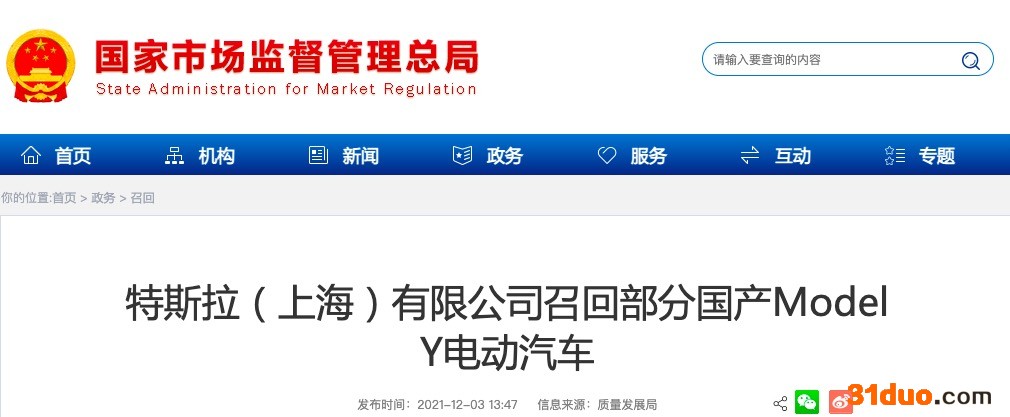 日前,特斯拉(上海)有限公司根据《缺陷汽车产品召回管理条例》和《缺陷汽车产品召回管理条例实施办法》的要求,向国家市场监督管理总局备案了召回计划。自即日起,召回生产日期在2021年2月4日至2021年10月30日期间的部分国产Model Y电动汽车,共计21599辆。