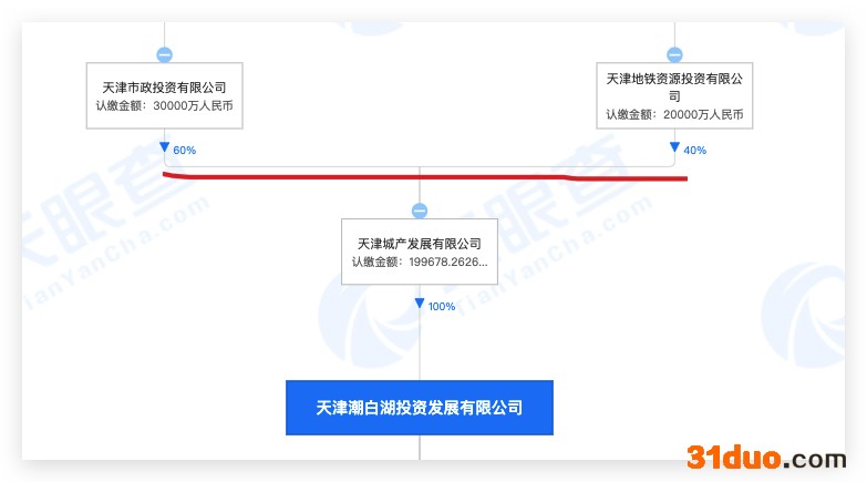 中华网财经从天眼查查询了解到,透过穿透股权关系,天津潮白湖投资发展有限公司是天津城产发展有限公司的全资子公司。