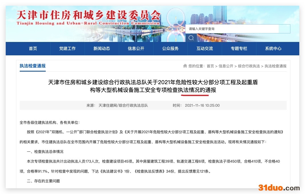 中华网财经12月3日讯:据天津市住房和城乡建设委员会官网近期发布的《天津市住房和城乡建设综合行政执法总队关于2021年危险性较大分部分项工程及起重盾构等大型机械设备施工安全专项检查执法情况的通报》显示,按照《2021年“双随机、一公开”部门联合检查执法计划》及《关于开展2021年危险性较大分部分项工程及起重、盾构等大型机械设备施工安全检查执法的通知》的相关要求,市住建执法总队在全市范围内开展了危险性较大分部分项工程及起重、盾构等大型机械设备施工安全检查执法活动。