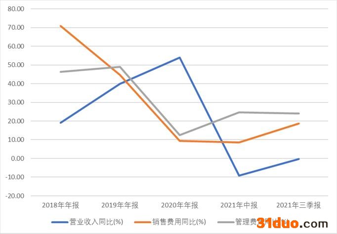 除了债务结构问题外,华发股份的营业收入同比增速与销售费用及管理费用的同比增速出现明显的差异。数据显示,2018年至2021年三季度,公司营业收入的同比分别为18.99%、39.87%、53.87%、-0.32%,而管理费用同比为46.21%、48.99%、12.57%及23.96%,销售费用的同比为70.86%、44.62%、9.45%及18.75%。