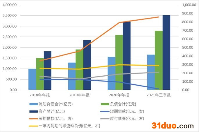 短期的大踏步前进,带来的是高企负债与不良的债务结构。数据显示,2018-2020年末和2021年9月末,发行人负债总额分别为1,500.25亿元、1,908.16亿元、2,584.99亿元和2,781.46亿元,资产负债率分别为82.34%、81.51%、80.32%和78.98%;扣除预收款项(含合同负债)后,其他负债占资产总额的比重分别为60.92%、56.51%、63.98%和58.96%。